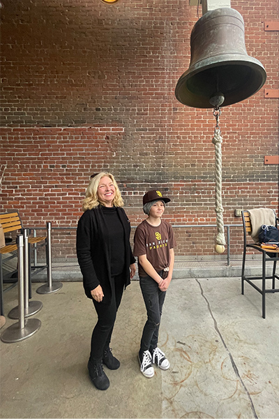 - May 1: Pictured (L to R): Debra Schwartz, Past Mission Fed President and CEO (Retired), and 9-year-old Bellringer Gracie
